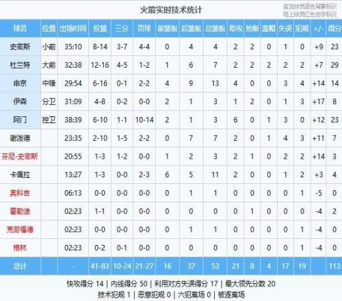 杜蘭特29分7板2助2斷2帽、史密斯23分4板2助2斷、阿門(mén)23分3板6助、申京14分13板4助、伊森8分3板1助2斷、謝潑德7分7板2助、卡佩拉4分11板2助