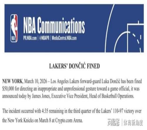 就在今日,NBA聯(lián)盟以官方之姿,擲地有聲地發(fā)布了一則引人矚目的公告,瞬間在籃球界掀起了層層波瀾——達(dá)拉斯獨(dú)行俠隊(duì)的璀璨明星盧卡·東契奇,因在一場(chǎng)硝煙彌漫的對(duì)陣紐約尼克斯隊(duì)的激戰(zhàn)中,對(duì)當(dāng)值裁判做出了極具爭(zhēng)議且不當(dāng)?shù)氖謩?shì),而領(lǐng)到了聯(lián)盟一張沉甸甸的5萬美金罰單。