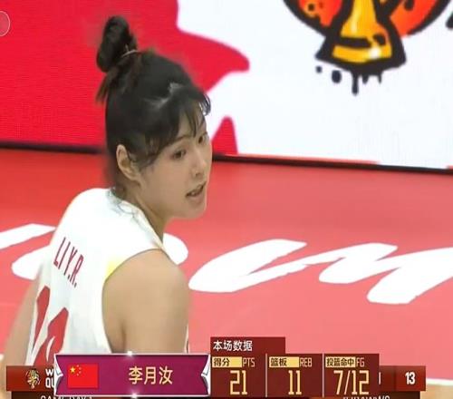 全場比賽,李月汝替補出場,打了20分鐘,投籃12中7,砍下了21分11籃板1助攻1搶斷的兩雙數據,其中,得分和籃板球都是排在全隊第一。毫無疑問,李月汝就是中國女籃贏球的關鍵先生。