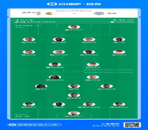 體育播報03月12日宣 皇馬官方公布了對陣曼城的首發,皇馬tv給出的陣型是442,維尼修斯、居萊爾搭檔鋒線。