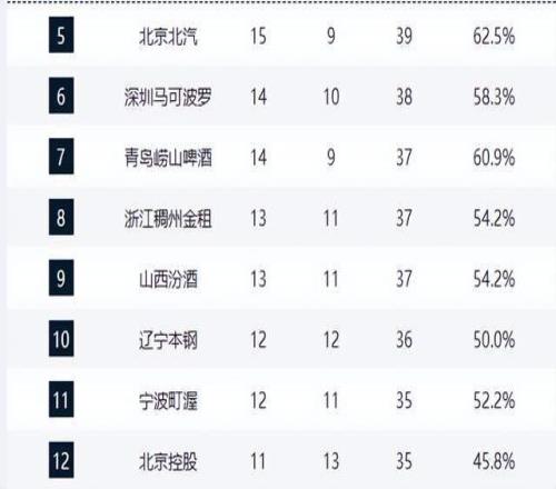 山東16勝8負緊咬廣東,北京15勝9負穩居第五,山西13勝11負殺入前九,季后賽席位爭奪已進入白熱化。