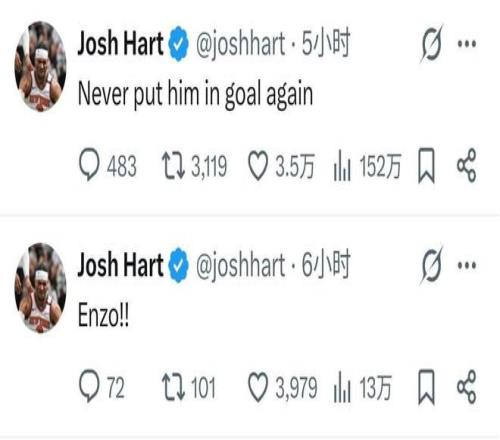 紐約尼克斯后衛約什-哈特是一名切爾西球迷,他曾多次出現在現場觀看切爾西的比賽。從社媒動態的發布時間看,約什-哈特應該是觀看了切爾西的比賽直播,顯然,他被約恩森的表現氣壞了,他在社交媒體上寫道:“別再讓他守門了”。