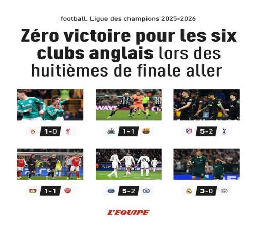 在歐冠八分之一決賽首回合比賽中,英超六支球隊均未能取勝,據《隊報》統計,這是自2022-2023賽季以來,英超俱樂部在該賽事同一階段首次出現此類情況。