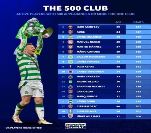 畢爾巴鄂前鋒伊納基·威廉姆斯如今已為球隊出戰500場比賽,在現役球員中排名第19位。在現役球員中,為單一俱樂部至少出戰500場比賽的球員中,阿金費耶夫以817場居首,科克以727場位居次席,諾伊爾則以590次位居第4位。