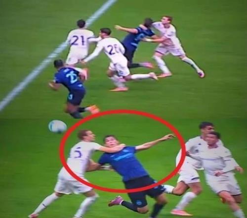 凱芙侖圖拉姆的犯規動作之明顯,連當值主裁判都已經將哨子含在了嘴里, 然而,就在電光火石之間,裁判收回了哨聲,VAR也沒有介入,進球居然有效。