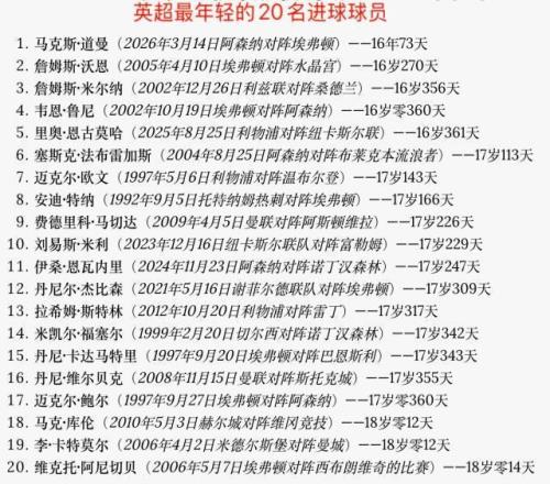 更絕的是,阿森納絕殺的兩個進球,是由替補上場的4名球員分別完成的助攻和進球。當日16歲73天的道曼,成為英超歷史上最年輕的進球者。