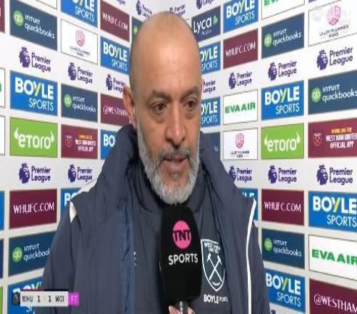 英超第30輪,西漢姆聯主場1-1戰平曼城,西漢姆聯主帥努諾賽后接受了TNT體育的采訪。