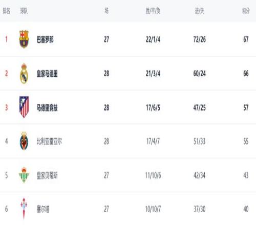 在積分榜上,巴薩依然高居榜首,戰(zhàn)績是22勝1平4負(fù),拿到67分?;蜀R贏球之后,總積分達(dá)到66分,僅僅落后巴薩1分,屈居第2名。不過,皇馬比巴薩多踢1場。顯然,巴薩還是占據(jù)奪冠主動權(quán)。馬競贏球之后,總積分達(dá)到57分,排名升到第3。而比利亞雷亞爾以55分排名第4。第5的是皇家貝蒂斯,只拿到43分,想要進(jìn)一步提升排名基本是不可能的事情。