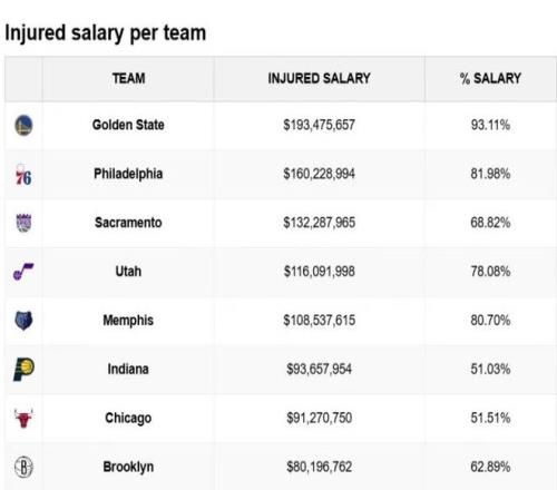 一項冷冰冰的統計, 勇士目前的傷員薪水已經達到了1.93億美元,占全隊工資的93.11%,兩個數字都是高居聯盟第一;