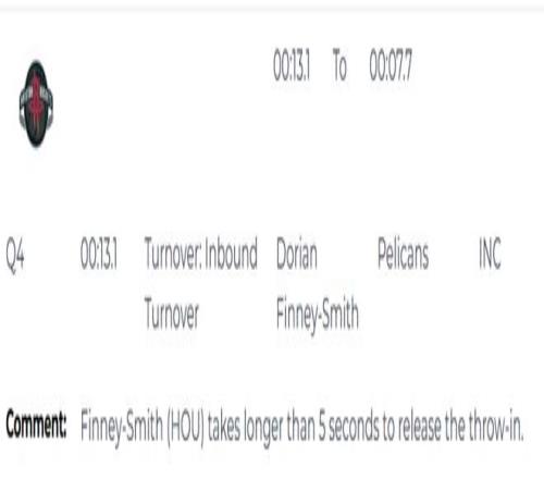 唯一的漏判發生在第四節最后13秒,芬尼-史密斯發邊線球5秒違例,但裁判沒有吹罰。這個球發出后,杜蘭特完成了制勝一擊,中距離跳投命中??紤]到杜蘭特進球前火箭是落后的一方,裁判若吹了5秒違例,鵜鶘將獲得球權,并有1分領先優勢,他們顯然是更有可能拿下勝利。顯然,火箭占了一個大便宜。