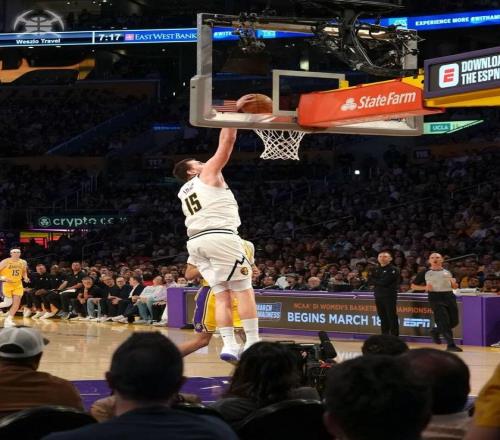 最后15.1秒,約基奇打進,追平。湖人前場邊線球,東契奇面對夾擊,底線中距離后仰命中,留給掘金0.5秒。