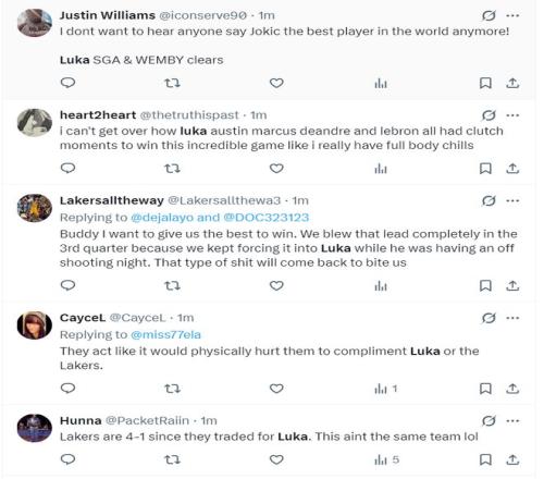 更多的湖人球迷認為東契奇是超級巨星,有一項數(shù)據(jù),湖人交易得到東契奇后面對掘金的戰(zhàn)績是4勝1負,他打破了湖人的恐懼丹佛魔咒。