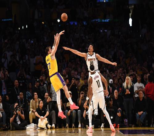 東契奇單打手感火熱,招牌撤步三分連續單吃約翰遜和布勞恩換防;掘金試過用約老師去對位斯瑪特,湖人繼續用東契奇+斯瑪特擋拆反制——只要斯瑪特能投進外彈三分,湖人就能讓約老師在防擋拆中付出代價。