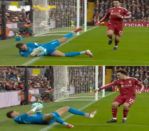 面對(duì)由本方球員觸碰而來(lái)的皮球,維卡里奧不想給利物浦角球機(jī)會(huì),于是選擇縱身救球。然而,由于即將滑出禁區(qū),維卡里奧不得不選擇“急剎車(chē)”,但他在轉(zhuǎn)身的過(guò)程中將球抱出了底線(xiàn)。從回放來(lái)看,這其實(shí)是利物浦一個(gè)明顯的角球。