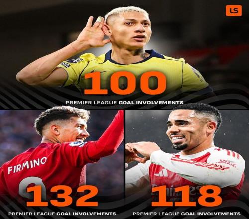 至此,里沙利松英超生涯268次出場已直接參與100球,包括73球27助(其中對陣利物浦參與6球3助為最多)。