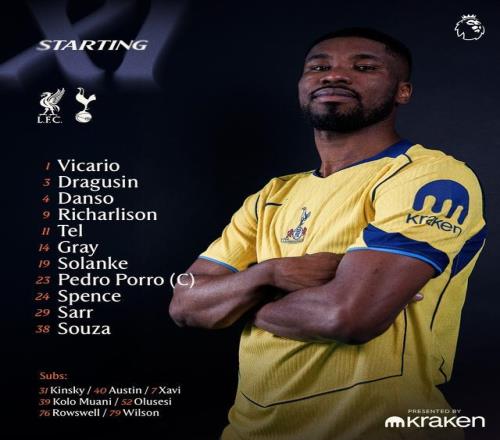 熱刺首發(fā):1-維卡里奧、3-德拉古辛、4-凱文-丹索、23-波羅、38-索薩、29-帕普-薩爾、14-阿奇-格雷、24-斯彭斯、11-馬蒂斯-特爾、9-里沙利松、19-索蘭克
