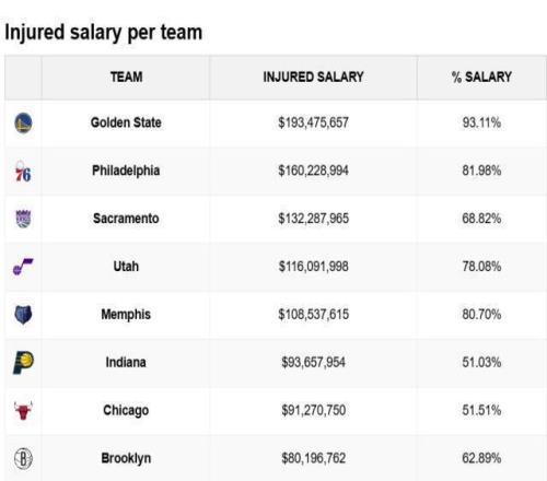 根據統計,勇士受傷球員的總薪水已經高達1.93億美元,占全隊薪水的93.1%,聯盟最高。他們今天派出的首發是波杰姆斯基、理查德、桑托斯、萊昂斯、波斯特,5人合計年薪不到1000萬美元!
