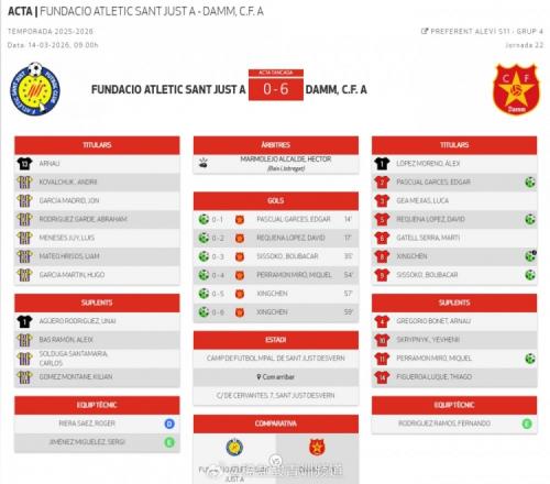 博主“稀鹽酸青訓(xùn)頻道”寫道:當(dāng)?shù)貢r(shí)間3月14日上午,西班牙加泰羅尼亞大區(qū)U11優(yōu)選聯(lián)賽(1)第四組第22輪,達(dá)姆U11A隊(duì)6:0戰(zhàn)勝圣胡斯特競(jìng)技U11A隊(duì),中國(guó)球員金星辰(2015)首發(fā)出戰(zhàn)梅開二度。