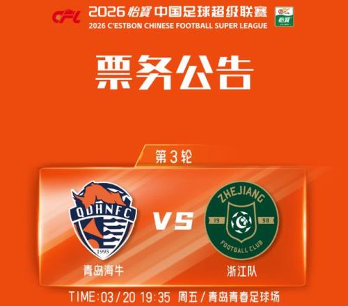 3月20日(星期五)19:35,在2026賽季中超聯賽第3輪的一場關鍵爭奪中,青島海牛坐鎮主場青島青春足球場,迎戰浙江隊。賽前,青島海牛發布了此役的票務公告。