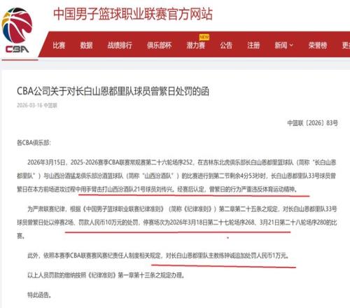 同時,吉林隊主教練鐘誠負有管理責任,對他也是進行了追加處罰,罰款10000元。