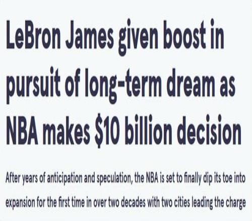 在多年的期待與猜測之后,NBA終于將在二十多年后首次啟動擴軍計劃,西雅圖和拉斯維加斯有望成為NBA兩支新軍所在的城市。NBA即將就期待已久的聯盟擴軍進行投票。美媒表示,這一消息將讓詹姆斯備受鼓舞。