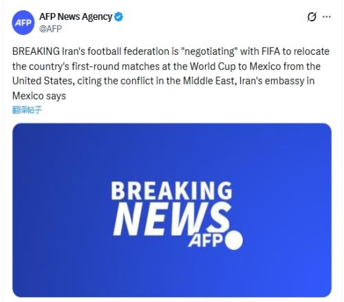 體育播報03月17日宣 據法新社報道,據伊朗駐墨西哥大使館消息,伊朗足協正與國際足聯"協商",將伊朗隊世界杯小組賽的比賽地點從美國遷至墨西哥進行,原因是中東沖突局勢。