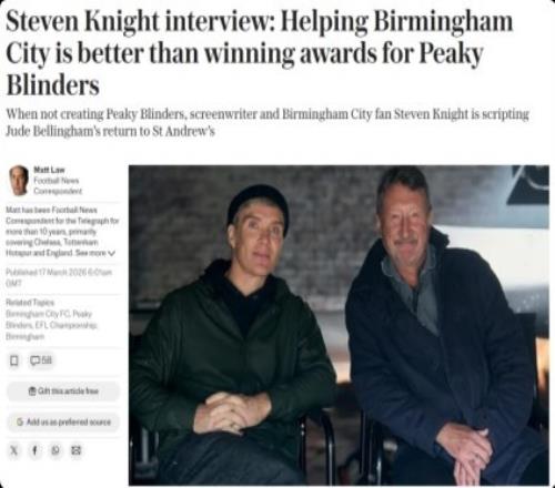 體育播報(bào)3月17日宣 《浴血黑幫》主創(chuàng)、伯明翰資深球迷史蒂文·奈特接受采訪,談到伯明翰新球場(chǎng)設(shè)計(jì)、對(duì)貝林厄姆回歸的憧憬、家庭與俱樂(lè)部的深厚淵源,以及《浴血黑幫》IP如何影響俱樂(lè)部現(xiàn)實(shí)。