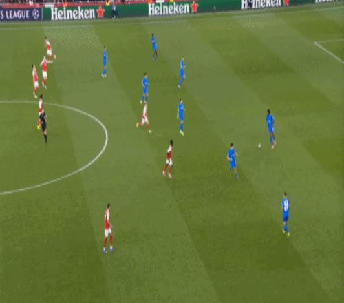 但是,隨著隊形的向前,三線的距離就會變得難以保持,這是面對比分落后的球隊最難以處理的問題,也是比分領先的球隊需要把握的機會,所以到了下半場,阿森納依然可以通過長傳球打進兩線之間,從而銜接射門: