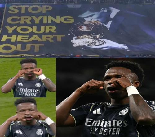 第22分鐘,維尼修斯操刀點(diǎn)球騙過唐納魯馬得分,皇馬1比0領(lǐng)先,總比分4比0。進(jìn)球后,維尼修斯做出“愛哭鬼”的動(dòng)作,回?fù)袈乔蛎詼?zhǔn)備的羅德里巨型海報(bào),并跑到角旗處示威慶祝。