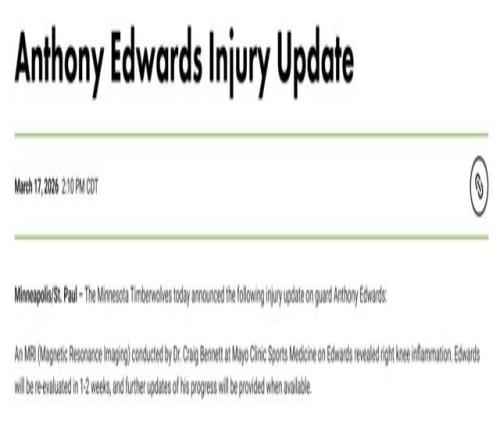 北京時間3月18日,森林狼隊官方宣布,安東尼-愛德華茲因右膝酸痛今日將缺戰太陽。他接受了核磁共振檢查,結果顯示其右膝存在炎癥。據森林狼方面透露,愛德華茲將在1~2周后接受復查,后續情況將在有更新時對外公布。