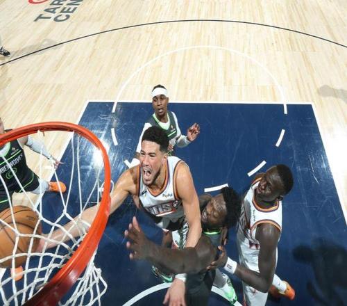 次節比賽,雙方第二節進攻火力均下滑單節不足30分,森林狼率先追到僅差1分,太陽也是沖擊內線擴大47-42領先。太陽之后取得57-51領先優勢,森林狼連追4分,太陽逐步以61-62被反超。雙方交替領先纏斗,太陽單節24-28輸掉4分,上半場結束太陽63-64被森林狼反超。前兩節比賽,太陽三分23中9,伊戈達羅14+5與布克14分;森林狼三分19中7,海蘭德15分、麥克丹尼爾斯12+7與蘭德爾13分。