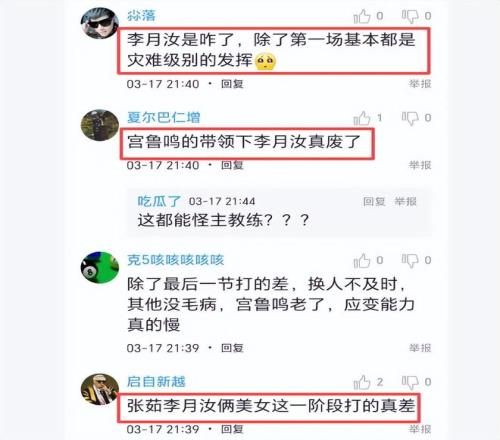 奇怪的是,昨晚在賽后采訪中,李月汝怪教練宮魯鳴不會用她,她也不解教練的戰術。他原話這樣說:可能需要我們教練更清楚怎么把我放在更合適的位置,我也需要跟教練主動去溝通我應該在怎么樣的時機出現在怎么樣的位置,確實后面這幾場球我也打得很別扭,我自己也打得不太高興。李月汝能回到國內參加這次比賽,值得表揚。但是個人認為,她賽后這番話經不起分析,人家韓旭與李月汝是同一時間回到國內,為什么韓旭又能基本發揮出自己的正常水平?說白了能否出色發揮還是靠自己去把握,與教練的關系不大。