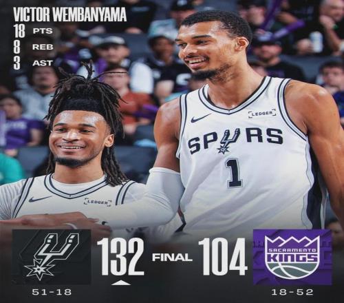 面對西部墊底的國王隊,馬刺首節(jié)39-22直接打花,半場78-47領先31分。馬刺13人出戰(zhàn),7人得分上雙:文班亞馬18分8板3助、凱爾登18分、尚帕尼17分、巴恩斯16分、福克斯15分5板6助、哈珀15分4板5助、沃特斯11分4板。