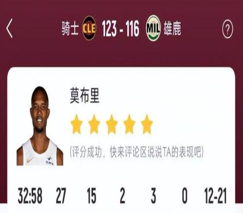由于雄鹿缺少字母哥坐鎮籃下,莫布里完全掌控籃板拼搶與護框大權,既能持球強攻取分,又能拼下前場板完成二次終結,3次封蓋更是直接掐滅雄鹿多次內線強攻企圖,騎士內線得分以56比34大幅領先,莫布里功不可沒。