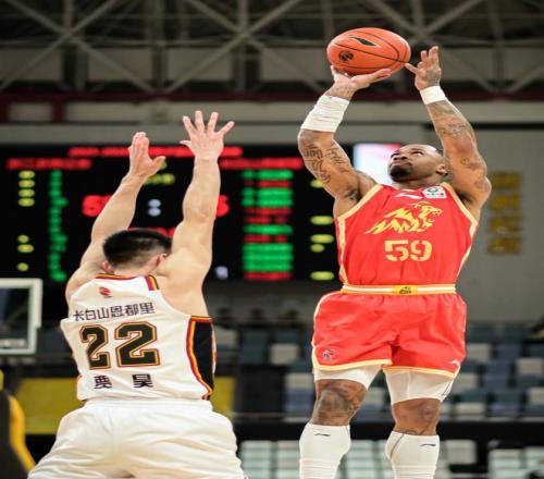 3月18日,浙江浙商證券隊(duì)球員雷瓊·塔克(右)在比賽中投籃。新華社記者 江漢 攝