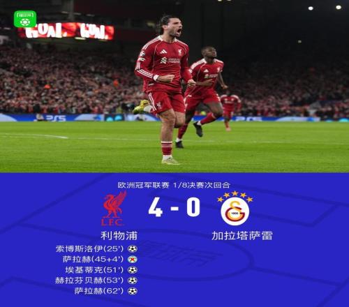 北京時間3月19日歐洲冠軍聯賽 1/8決賽次回合,利物浦對陣加拉塔薩雷。上半場,索博破門。隨后,索博造點,薩拉赫主罰被擋出。下半場,薩拉赫助攻,埃基蒂克建功。薩拉赫射門被撲出,赫拉芬貝赫補射得手。維爾茨做球,薩拉赫兜射轟入世界波。全場比賽結束,利物浦4-0擊敗加拉塔薩雷,同時也以總比分4-1淘汰對手成功晉級歐冠八強。