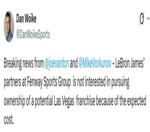 據兩位直接了解芬威意圖的消息源向The Athletic透露,詹姆斯自2011年起的商業伙伴、同時擁有波士頓紅襪與英超利物浦的芬威體育集團,目前無意競標拉斯維加斯的擴軍隊。其中一位未獲授權公開表態的消息源稱,這家全球體育投資公司退出,是因為預期成本過高——據報道,聯盟對每支擴軍球隊收取的加盟費最高可達80億美元。