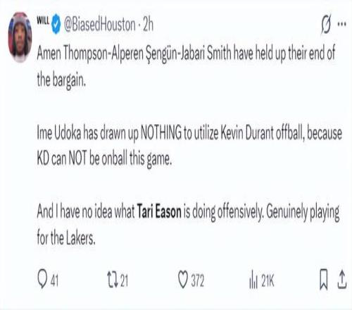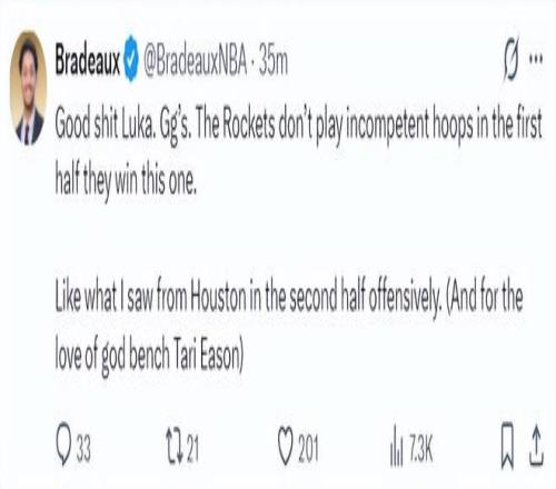 火箭記者Bradeaux:求求烏度卡,讓塔里-伊科回替補席去吧。
