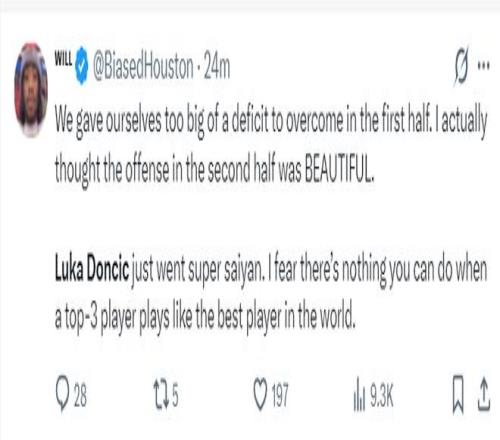 休媒都被東契奇打服:我們上半場給自己設(shè)定了追趕目標(biāo)結(jié)果沒能完成,但我們下半場進攻回暖。只可惜東契奇在決勝時刻達到了超級賽亞人的狀態(tài),當(dāng)一名聯(lián)盟前三的球員表現(xiàn)的跟全世界最佳一樣,我們已經(jīng)無能為力。
