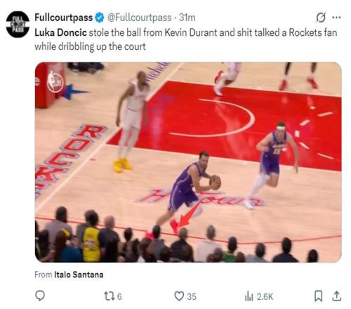 東契奇在開場制造了伊森三分犯規(guī)只可惜三罰都未能命中,隨后場邊有火箭球迷開始噴東契奇,這可惹怒了東皇,他搶斷杜蘭特后跟場邊球迷對噴,隨后東契奇打開了得分模式,前5中1的他后4投全中,單節(jié)9中4+三分6中3拿到13分3籃板3助攻1搶斷。