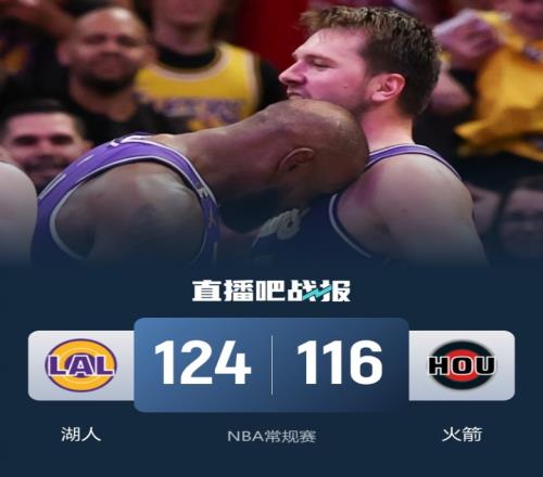 比賽開始,雙方開場勢均力敵,比分咬得很緊,東契奇火力全開,里突外投連續拿分,杜蘭特又有2次失誤,湖人打出11-2的攻擊波確立優勢,次節詹姆斯連續暴扣將分差拉開到兩位數,火箭全民皆兵苦苦支撐,東契奇延續火力擴大領先,半場戰罷湖人67-55領先火箭。易邊再戰,湖人突然啞火,火箭轟出20-5強勢反超,詹姆斯扣籃2+1穩住局勢,申京和杜蘭特聯手拿分,末節詹姆斯得分助攻一肩挑帶隊打出11-4奪回優勢,火箭9-0迅速回應,雙方爭奪陷入白熱化。關鍵時刻,東契奇連中三分,并先后助攻八村塁和詹姆斯暴扣,率隊打出攻擊波殺死比賽。最終,湖人124-116再勝火箭,豪取7連勝。