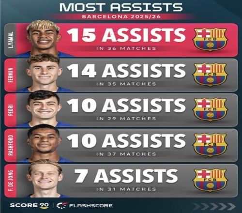 巴薩2025/26賽季隊內助攻最多