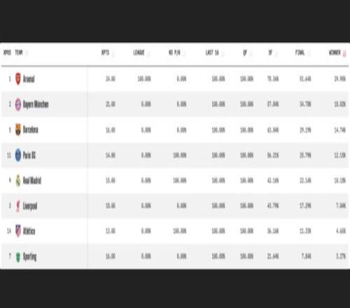 根據Opta的數據模型,目前最大的奪冠熱門是阿森納。槍手不僅在聯賽階段排名第一,還順利淘汰了勒沃庫森。