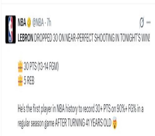 詹姆斯此役34分鐘,14中13,三分2中2,罰球3中2,拿到30分5籃板2助攻1搶斷1蓋帽,命中率92.9%,三分命中率100%,41歲的勒布朗打出如此逆天的效率讓東契奇都贊不絕口。