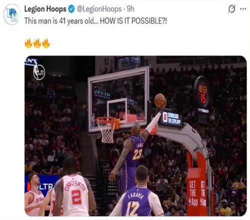 在勒布朗完成單臂劈扣空中接力時,美媒LH寫道:這是41歲球員能做到的事情?