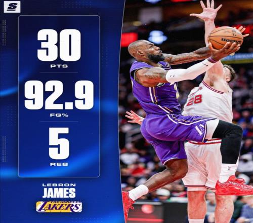 5.詹姆斯成為湖人隊史03年沙克后首位90%命中率+30分的球員;