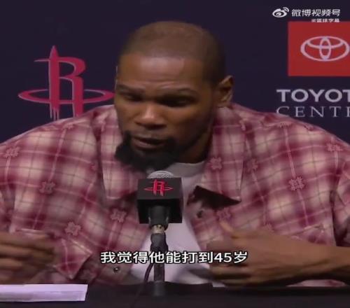 賽后采訪時,火箭隊當家球星杜蘭特表示,“我覺得他能打到45歲,我不知道他想不想打這么久,但說實話,我認為他還能再戰(zhàn)個四五年。這已經(jīng)不足為奇了,雖然他已經(jīng)41歲,但是在場上的狀態(tài)依然好的離譜。當你像他一樣熱愛這項運動,你會竭盡全力保持專注,維持巔峰水準,他整個人都非常勵志!”