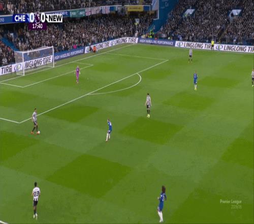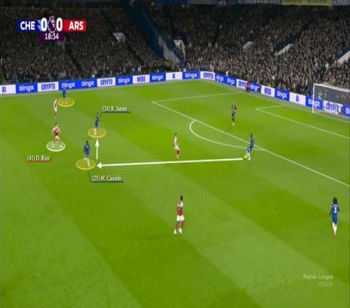 恩佐-費爾南德斯死守自己的防守目標雅各布-拉姆齊,不愿脫離崗位,讓利夫拉門托得以從中場長驅(qū)直入。前場方面,威洛克與沃爾特馬德突入鋒線,迫使各自的防守者里斯-詹姆斯、莫伊塞斯-凱塞多被迫回撤。