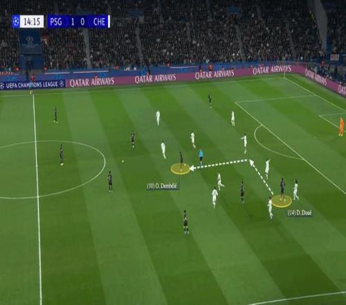 緊接著,登貝萊從中鋒位置回撤,牽制福法納跟防;隨后登貝萊突然啟動,試圖反插福法納身后,逼得切爾西中衛(wèi)連連后退,可登貝萊又瞬間變向,接回撤的巴爾科拉傳球。