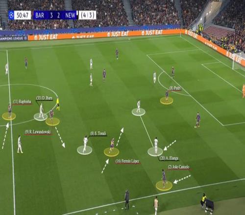 周三對陣紐卡一役,巴薩也采用了同款戰(zhàn)術(shù)拆解對手防線。